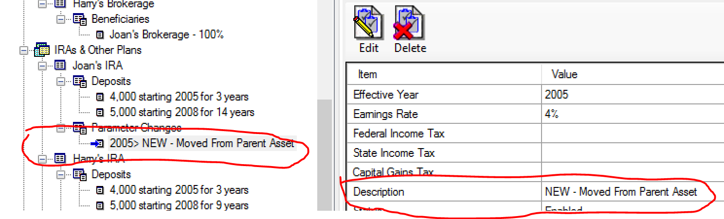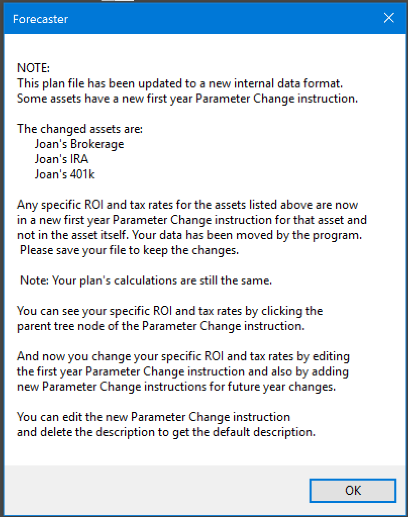 Assets in a plan created by the version 3 program may have had specific parameter data defined, such as a Roi rate or tax rates, to override the global rates. In the new version 4 program, asset parameters for these rates cannot be specified in the definition of the asset. Instead these specific values are specified by adding a Parameter Change instruction for the asset which is effective in the first plan year. This accomplishes the same result and is more in tune with the overall usage of Parameter Change instructions.