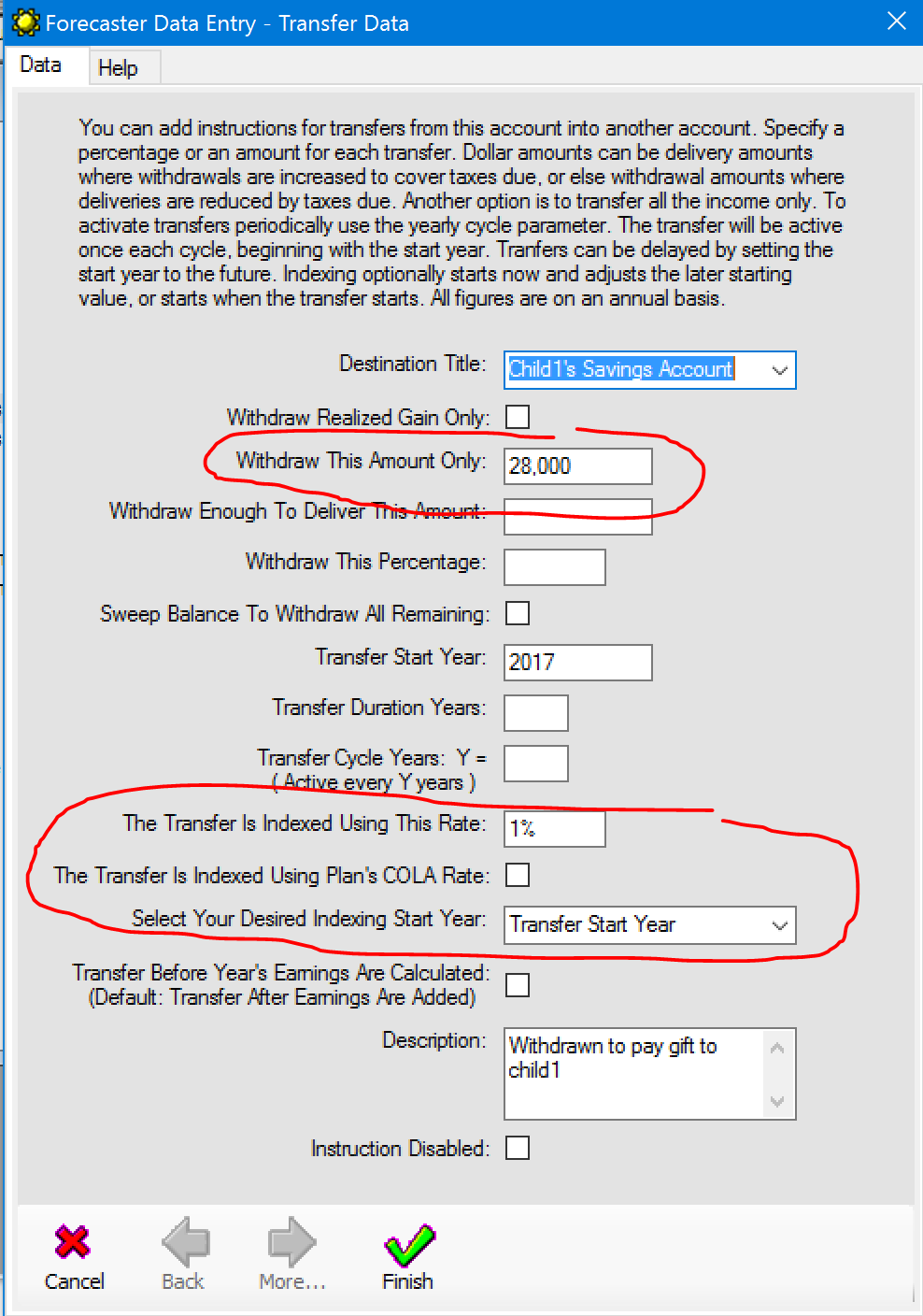 An additional way has been added to specify transfer instructions. There are some cases where the amount to be delivered to the recipient must be a fixed value, regardless of withdrawal taxes and/or gift taxes. For example when you are specifying a transfer to pay a life insurance premium (for estate planning), the required premium amount must be delivered regardless of any taxes that may occur. To cover this, the withdrawn amount is bumped up by the program to cover necessary taxes.