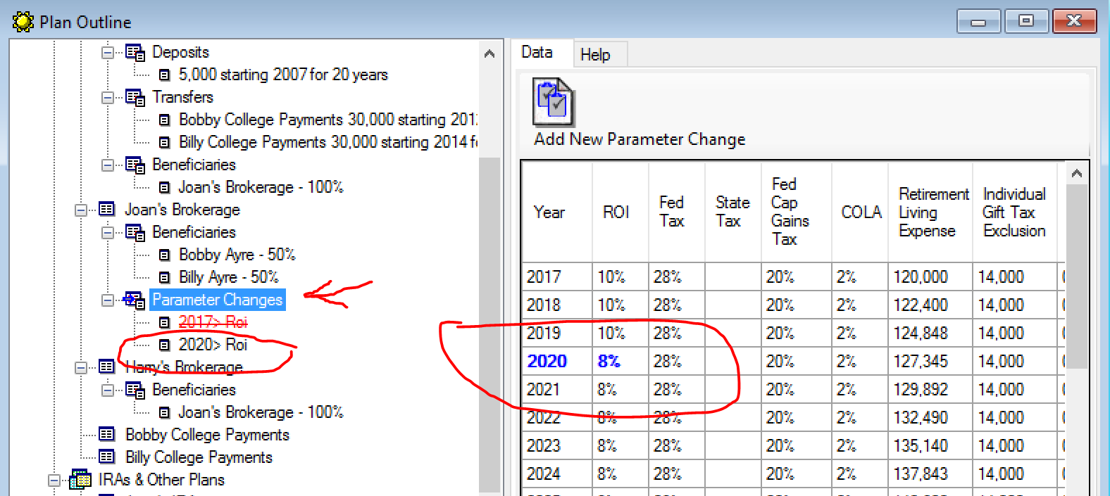 In the figure above, Joan's Brokerage has applied a Parameter Change in 2020 to set the ROI to 8%. A click on the Parameter Change leaf in the outline tree shows all the Global Parameters that affect calculations for Joan's Brokerage. The local change just for Joan's Brokerage is shown in blue. Note that the Parameter Change for 2017 has been disabled and does not show. It can be quickly enabled by double clicking.